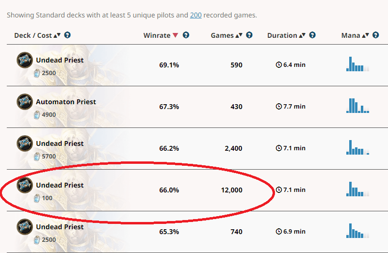 I removed the filter that was limiting it to my collection and looked for a deck where I had most of the cards I needed and where the winning percentage was over 50%. That gave me some very solid contenders. Even better, the top deck on the list was also an undead priest deck, and was not altogether different from what I was playing before Badlands changed the meta. At this point, I noticed that each of these decks had, below the title, the cost in dust to craft the cards that were missing from my collection.