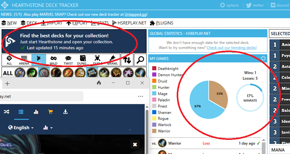 I’ve been using the Hearthstone Deck Tracker app to show my deck and the cards my opponent has played when I stream. I recently noticed that inside the app itself is a box that says, “Find the best decks for your collection! Just start Hearthstone and open your collection.” That’s pretty on the nose for what I want to do, so tonight I’m trying that for the first time. Wait, no – that’s only half true. I’m trying it for the first time while I blog and plan the stream. Let’s call it the second time in the video.